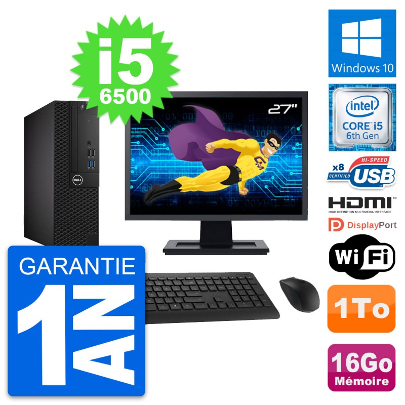 PC Dell OptiPlex 3050 SFF - Intel Core i5-6500 3.2 Ghz (6 Mo) - 16 Go DDR4 - Disque Dur 3,5" 1 To - Clef Wifi USB - Windows 10 - Livré avec Ecran 27" + clavier + souris (Marques et modèles variables) - Garantie 1 an.