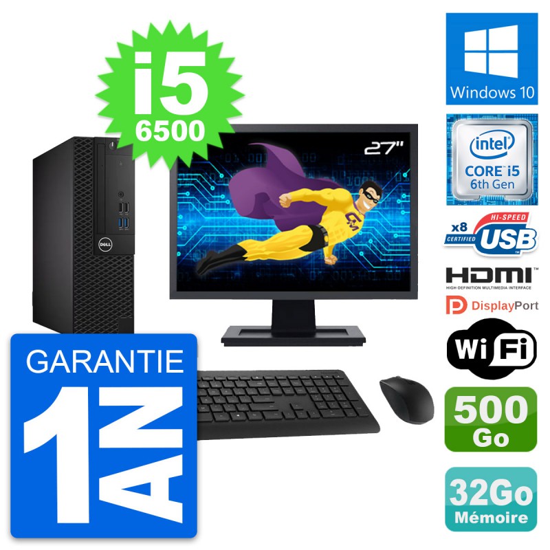 PC Dell OptiPlex 3050 SFF - Intel Core i5-6500 3.2 Ghz (6 Mo) - 32 Go DDR4 - Disque Dur 3,5" 500 Go - Clef Wifi USB - Windows 10 - Livré avec Ecran 27" + clavier + souris (Marques et modèles variables) - Garantie 1 an.