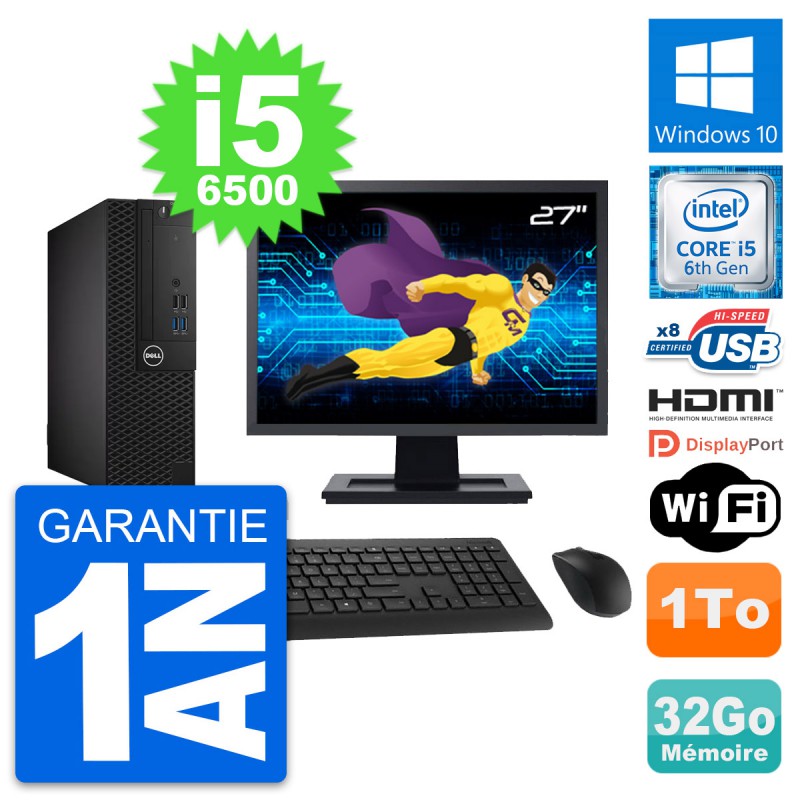 PC Dell OptiPlex 3050 SFF - Intel Core i5-6500 3.2 Ghz (6 Mo) - 32 Go DDR4 - Disque Dur 3,5" 1 To - Clef Wifi USB - Windows 10 - Livré avec Ecran 27" + clavier + souris (Marques et modèles variables) - Garantie 1 an.